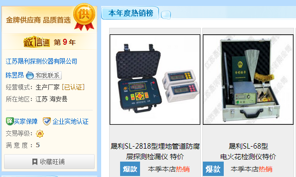江蘇晟利探測儀器有限公司經(jīng)過阿里巴巴官方就資質(zhì)、服務(wù)、產(chǎn)品等多方面嚴(yán)格審核,2014年榮獲阿里巴巴“金牌供應(yīng)商”稱號。再次證明了我公司在行業(yè)內(nèi)的領(lǐng)導(dǎo)品牌地位,同時(shí)也說明我公司產(chǎn)品質(zhì)量和服務(wù)得到了業(yè)內(nèi)和廣大消費(fèi)者的認(rèn)可。