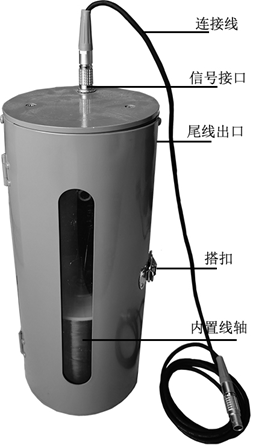 尾線計(jì)距儀裝置是一個圓柱形筒狀,背包式,內(nèi)部安裝有帶金屬銅線的線軸、計(jì)距輪。尾線通過尾線出口拖出與測試樁處的管道電纜相連接。尾線的另一端必須連接到線軸的固定桿上,再通過連接線與記錄儀的計(jì)距儀輸入端口相連接。